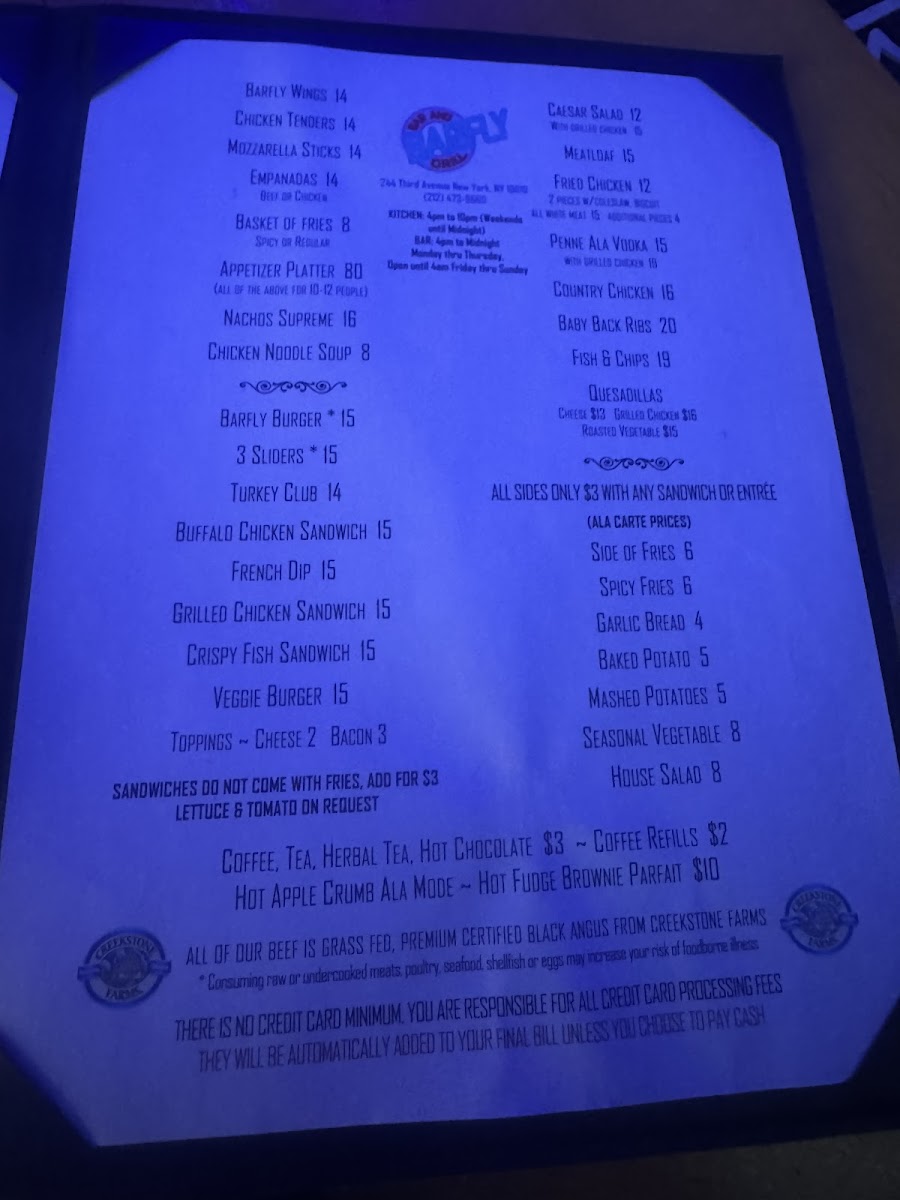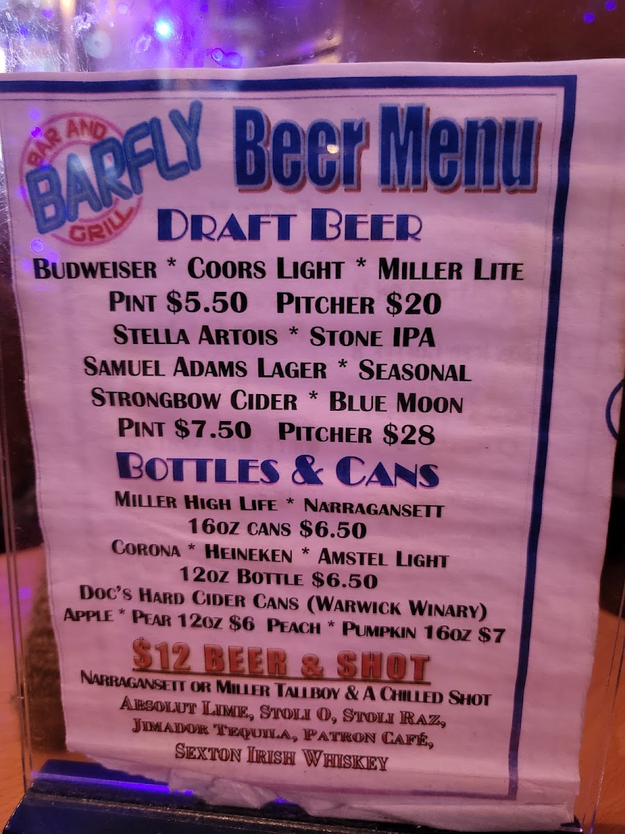 - Entrees: Features dishes like the Barfly Chili made with black angus beef and Guinness stout, NY strip steak accompanied by a baked potato and vegetables, beef stew prepared with Belgian beer, and parmesan-crusted pork chop served with mashed potatoes and seasonal vegetables.